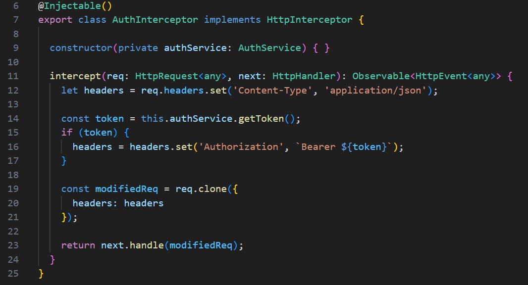 L’AuthInterceptor injecte le header Authorization pour chaque requête — centralisation = moins d’erreurs. Voir : auth.interceptor.ts.