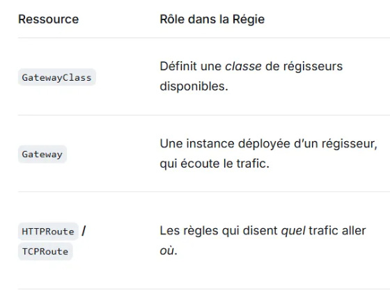 Ces ressources créent un modèle découplé et flexible : l’équipe Dev définit les routes (HTTPRoute), l’équipe Platform provisionne la passerelle (Gateway), et l’infrastructure sous-jacente est définie par la classe (GatewayClass).